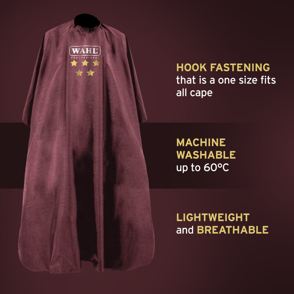 The Wahl Professional Cape in Burgundy is a heavy duty and long lasting, large haircutting cape that features a water resistant finish and is washable up to 60 ⁰C. Washing at a higher temperature with a good detergent can help to kill bacteria and viruses. Keep unwanted hair and hair products off customers and their clothes with our water resistant and anti-static professional cape, made from 100% Polyester .