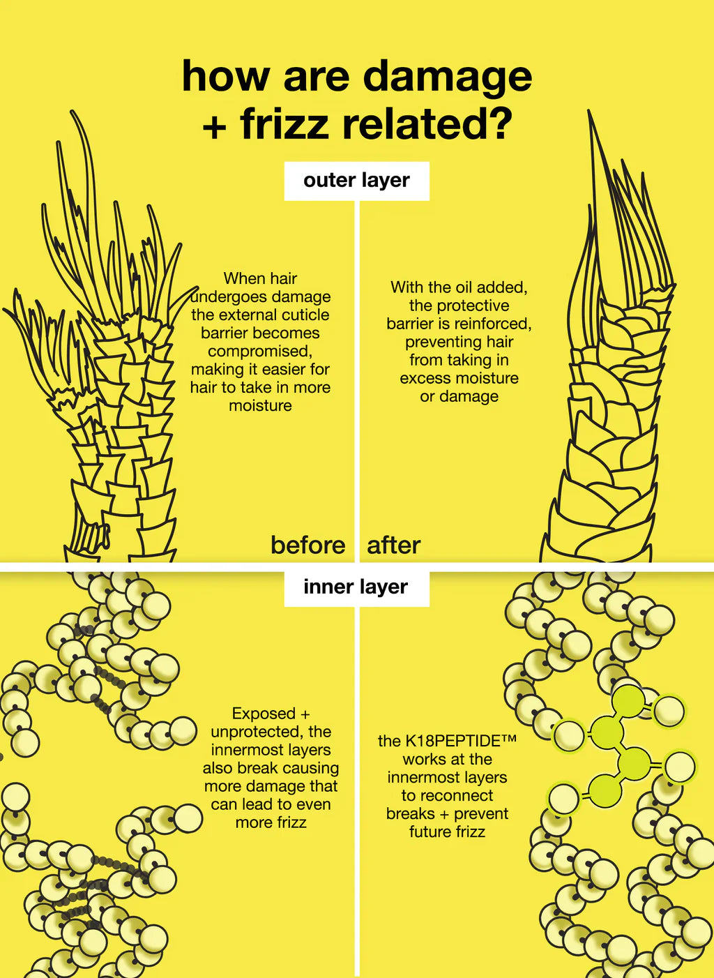 The K18PEPTIDE works to address deeper-level damage that causes frizz—repairing and strengthening damage at the innermost layer of hair to reverse damage that leads to frizz.