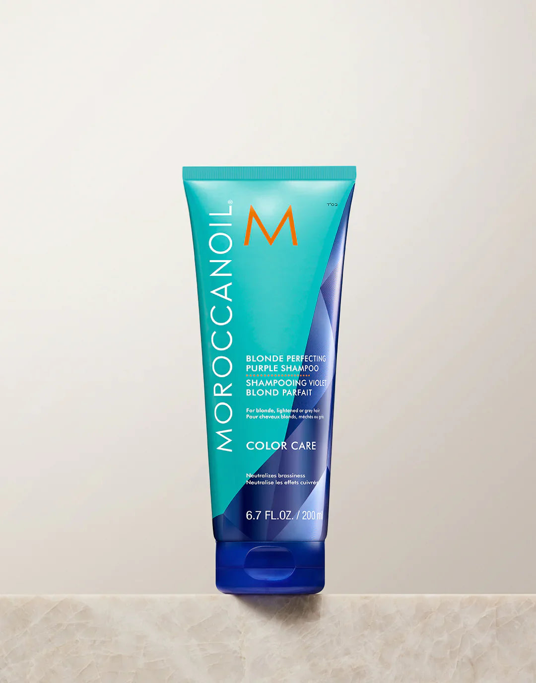 MOROCCANOIL COLOR CARE BLONDE PERFECTING PURPLE SHMAPOO For Blonde, Lightened Brunette, and Grey Hair A pro-strength purple shampoo to gently cleanse while neutralizing brassiness and helping to restore brighter, more radiant color.