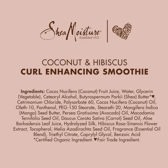 Description: SheaMoisture's Coconut & Hibiscus Curl Enhancing Smoothie is a rich, creamy hair treatment designed to nourish, define, and moisturize curly hair. Enriched with natural and organic ingredients like coconut oil, shea butter, and hibiscus flower extract, this smoothie helps to hydrate curls, reduce frizz, and enhance curl definition for bouncy, beautiful curls