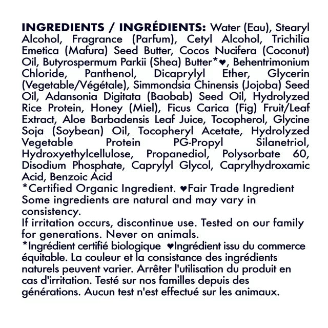 WATER (EAU), STEARYL ALCOHOL, FRAGRANCE (PARFUM), CETYL ALCOHOL TRICHILIA EMETICA (MAFURA) SEED BUTTER, COCOS NUCIFERA (COCONUT) OIL, BUTYROSPERMUM PARKII (SHEA) BUITER, BEHENTRIMONIUM CHLORIDE, PANTHENOL, DICAPRYLYL ETHER, GLYCERIN (VEGETABLE/VEGETALE), SIMMONDSIA CHINENSIS (JOJOBA) SEED OIL, ADANSONIA DIGITATA (BAOBAB) SEED OIL, HYDROLYZED RICE PROTEIN, HONEY (MIEL), FICUS CARICA (FIG) FRUIT/LEAF EXTRACT, ALOE BARBADENSIS LEAF JUICE, TOCOPHEROL, GLYCINE SOJA (SOYBEAN) OIL, TOCOPHERYL ACETATE, HYDROXYETHYLCELLULOSE, PROPANEDIOL, POLYSORBATE 60, DISODIUM PHOSPHATE, CAPRYLYL GLYCOL,